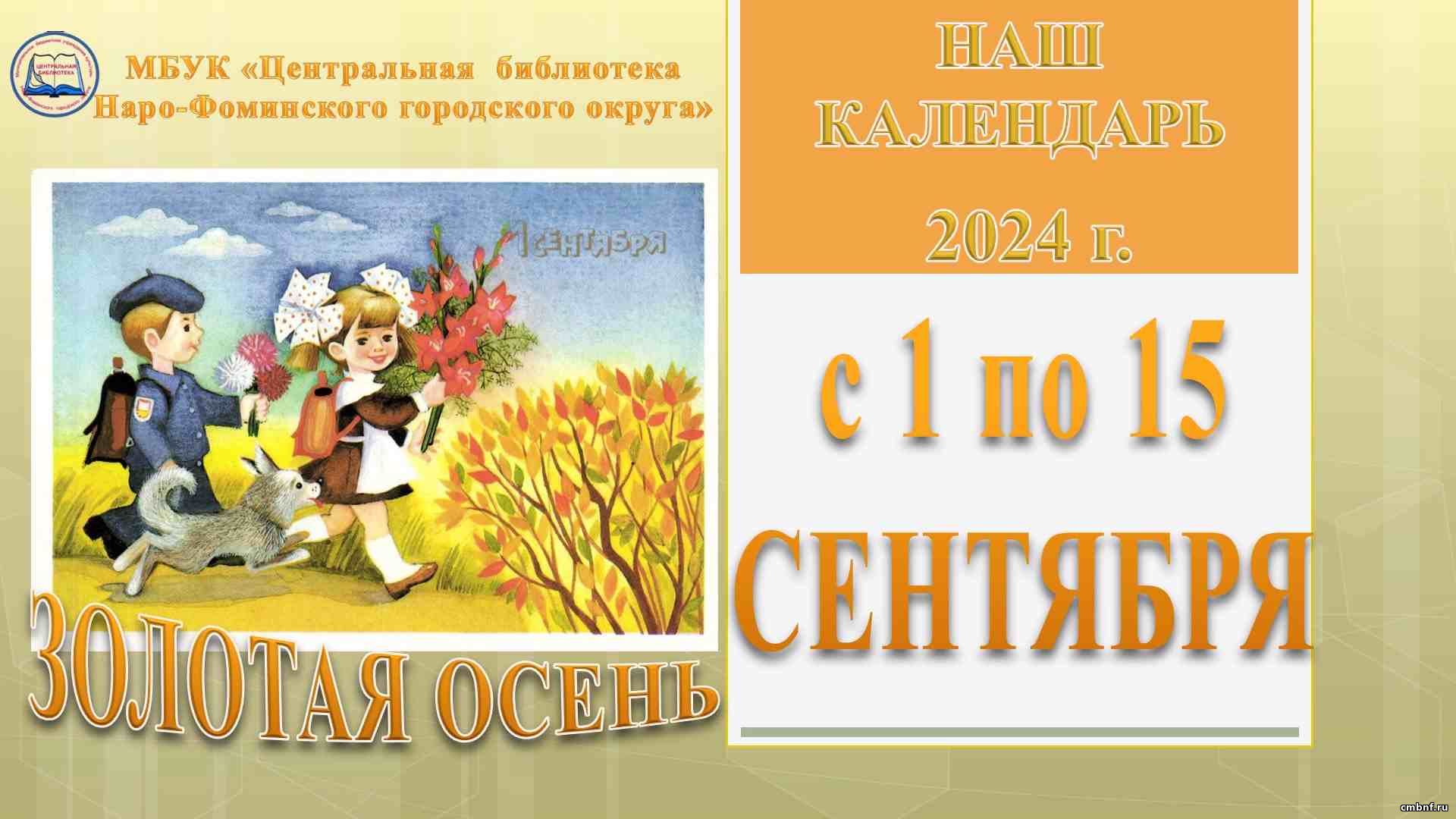 Представляем вашему вниманию календарь знаменательных и памятных дат с 1 по 15 сентября 2024 года, подготовленный ведущим библиографом МБУК «ЦБ Наро-Фоминского городского округа» Ириной Лукьяновой.