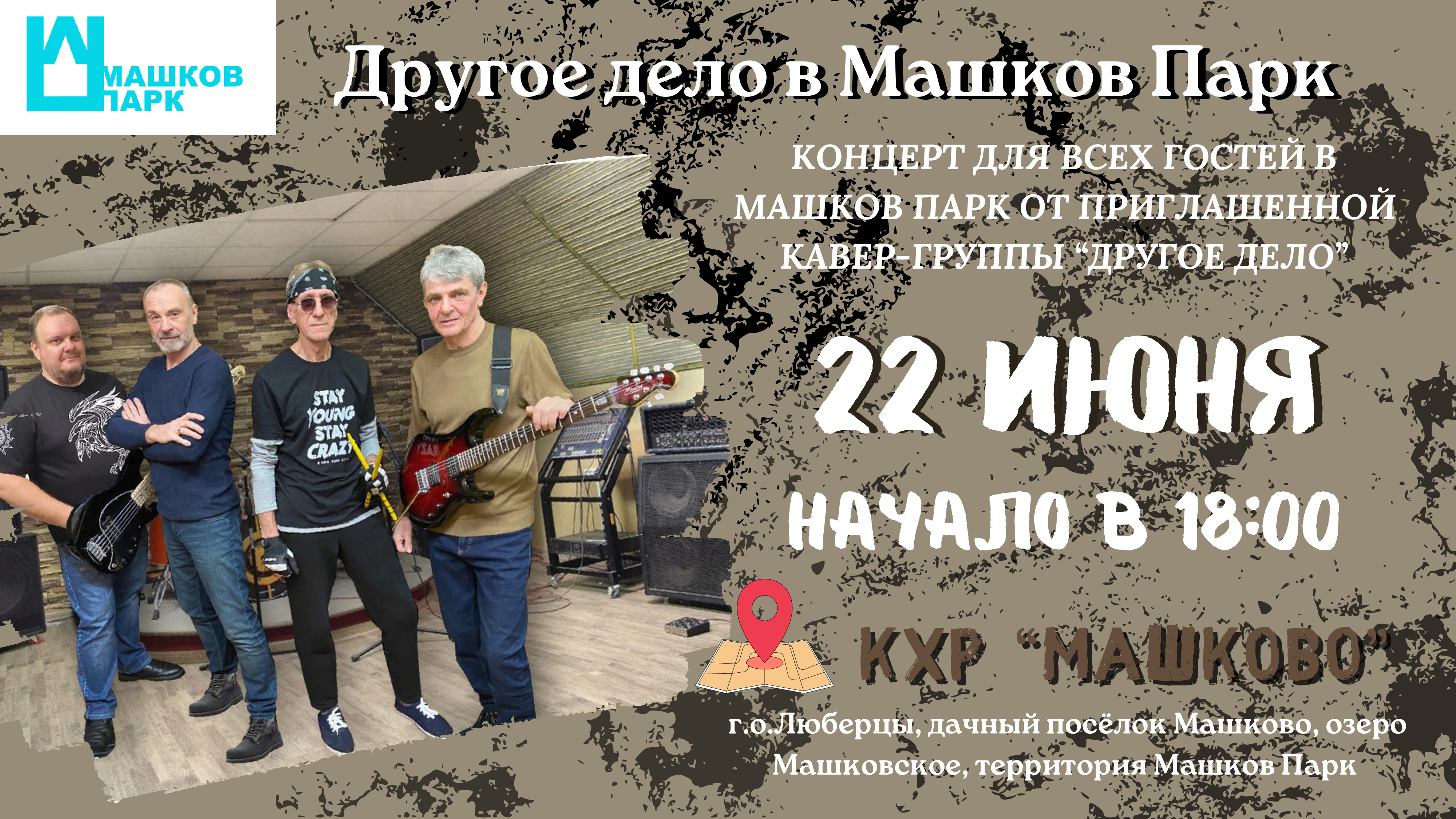 15052 просмотров В субботу, 22 июня, для люберчан и гостей округа в комплексе «Машков Парк» пройдёт концерт кавер-группы «Другое дело» в рамках проекта губернатора Московской области Андрея Воробьева «Лето в Подмосковье».