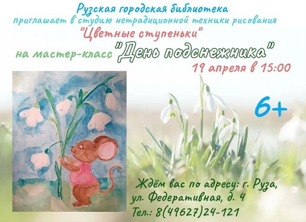 Мастер-класс «День подснежника» состоится 19 апреля в 15 часов в студии нетрадиционной техники рисования «Цветные ступеньки» Рузской городской библиотеки.