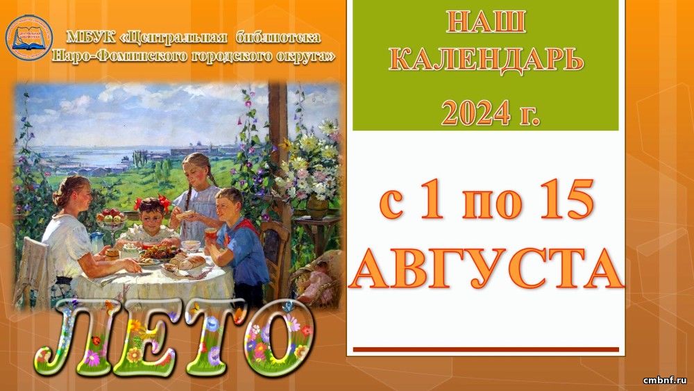 Представляем вашему вниманию «Наш календарь» знаменательных и памятных дат с 1 по 15 августа 2024 года, подготовленный ведущим библиографом МБУК «ЦБ Наро-Фоминского городского округа» Ириной Лукьяновой.