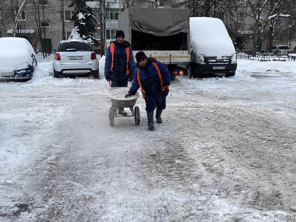 На Нахабинском шоссе работники ООО «Дорстрой» почистили пешеходные дорожки и посыпали их противогололедным материалом.