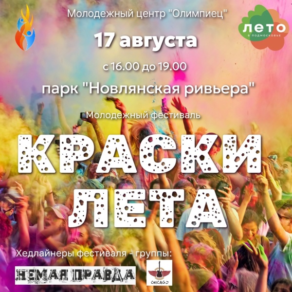 17 августа молодёжный центр «Олимпиец» приглашает воскресенцев и гостей округа на молодёжный фестиваль «Краски лета», который пройдет в зоне отдыха на набережной реки Москвы микрорайона Новлянский.