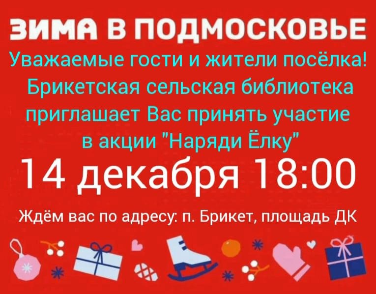 Брикетская сельская библиотека приглашает всех желающих принять участие в акции: «Наряди елку», которая состоится 14 декабря в 18.00. Мы ждем жителей и гостей поселка, чтобы вместе украсить зеленую красавицу и прекрасно провести время.