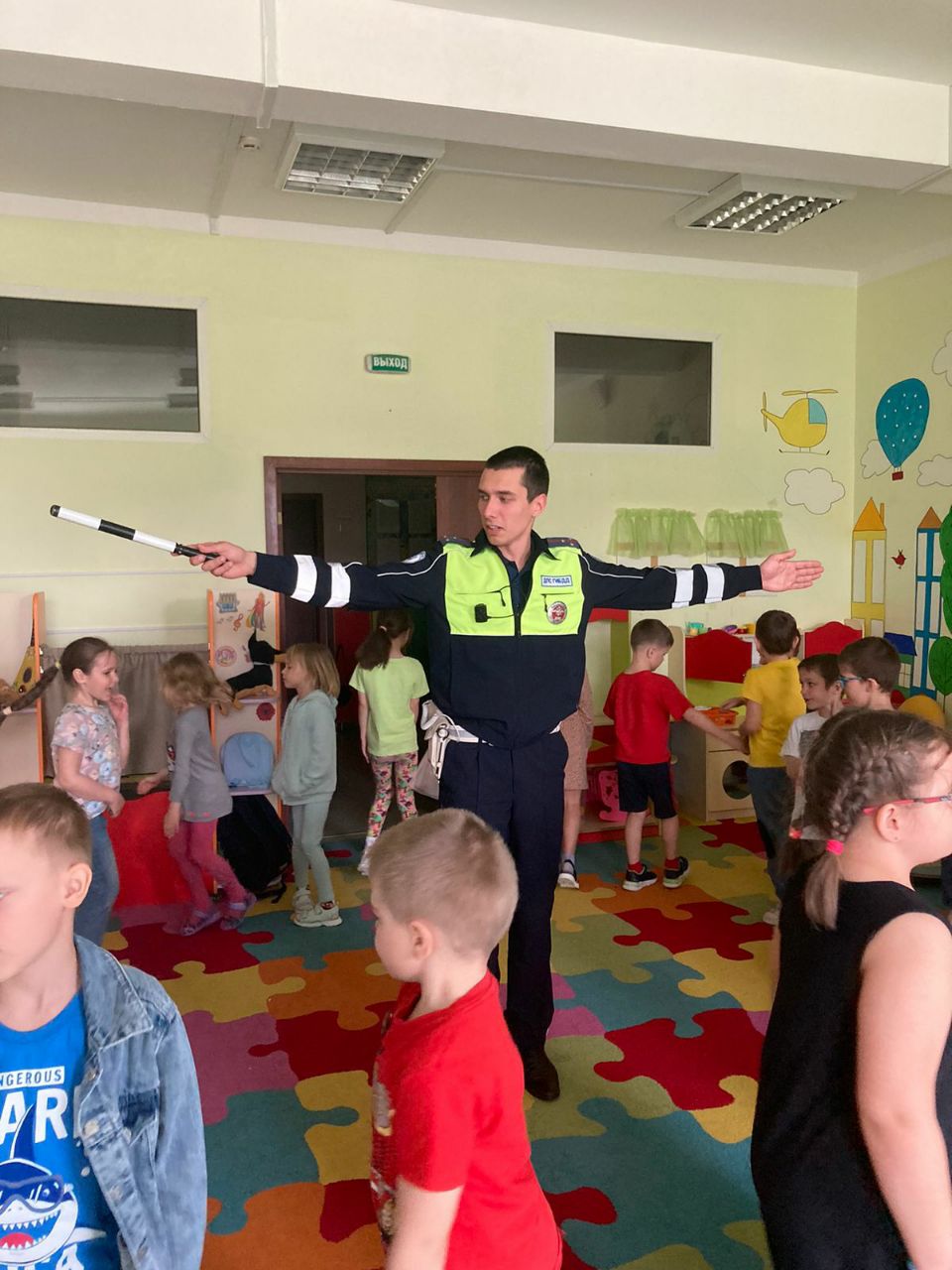 Гости в погонах рассказывают ребятам, какие правила должны соблюдать пешеходы, пассажиры и велосипедисты, какие ошибки они порой совершают.