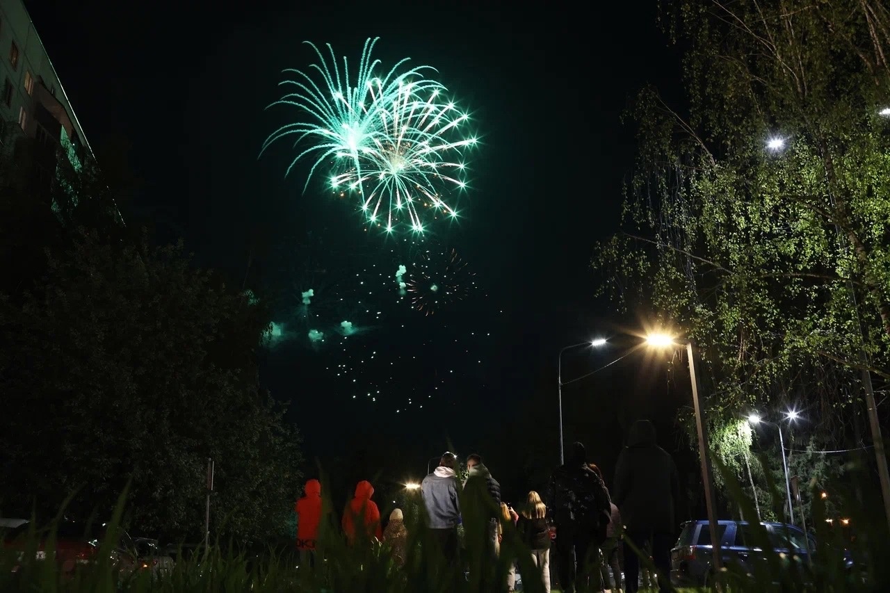 Завершился праздничный день ярким и очень долгим салютом. Разноцветные сверкающие гроздья распускались в ночном небе и, переливаясь, осыпались вниз, угасая на лету и какое-то время сохраняясь белыми кляксами дыма,