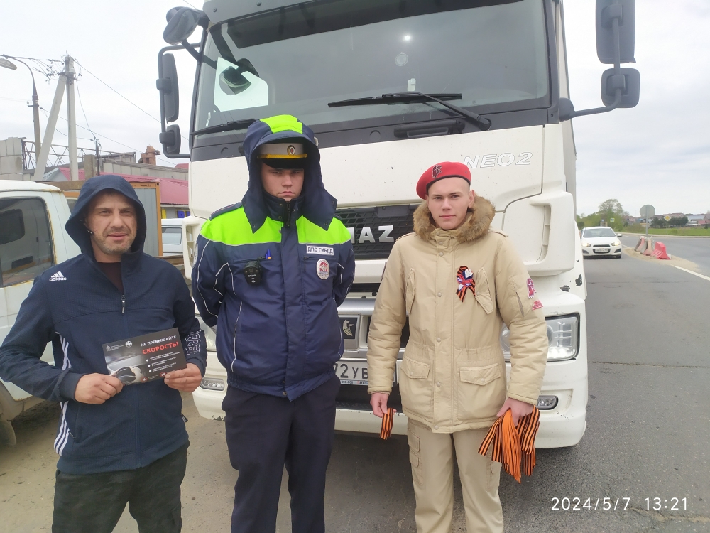 В очередной раз сотрудники Госавтоинспекции Талдомского городского округа совместно со старшими Юнармейцами отряда «Память» Квашенковской средней общеобразовательной школы напомнили с помощью тематических листовок водителям большегрузов о строгом соблюдении режима труда и отдыха и вручили георгиевские ленточки в преддверии праздника «День Победы»