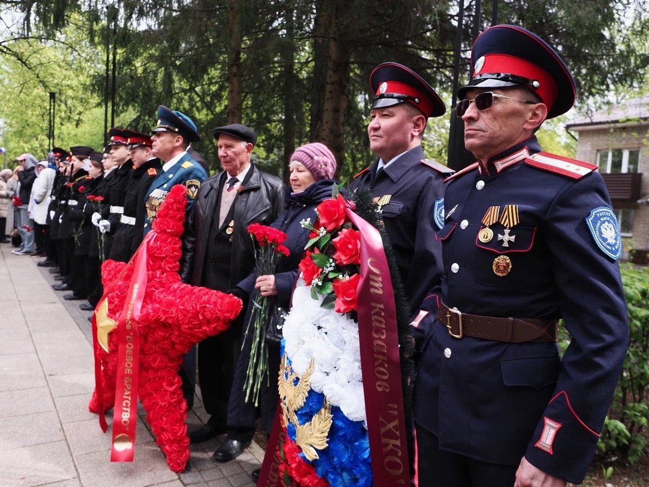 На площади Академика Верещагина активисты Молодёжной палаты раздали георгиевские ленточки, символ праздника, всем, кто пришёл в этот день к памятнику. У обелиска застыл почётный караул кадет 6-го отделения Гимназии.