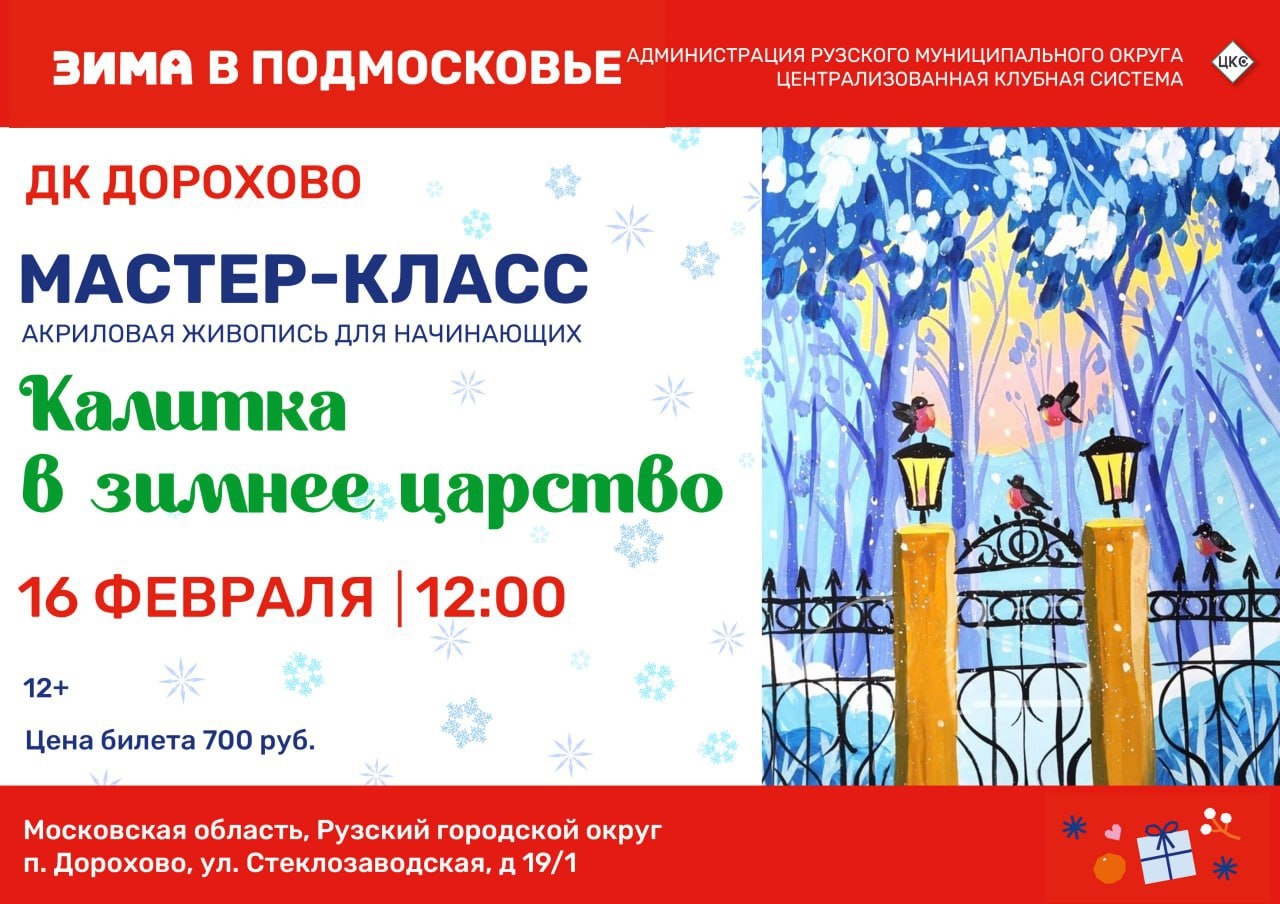 Дом культуры Дорохово приглашает всех желающих на мастер-класс «Калитка в зимнее царство», акриловая живопись для начинающих, 16 февраля в 12.00.