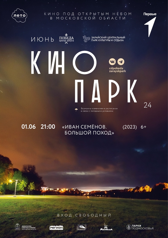 1 июня в рамках проекта «Кинопарк» в Зарайском центральном парке культуры и отдыха под открытым небом состоится кинопоказ художественного фильма «Иван Семёнов. Большой поход».