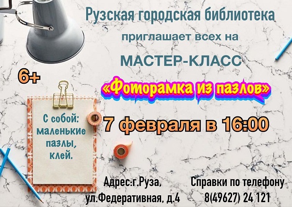 Сотрудники Рузской городской библиотеки приглашают девчонок и мальчишек на мастер-класс «Фоторамка из пазлов». Он состоится 7 февраля в 16 часов.